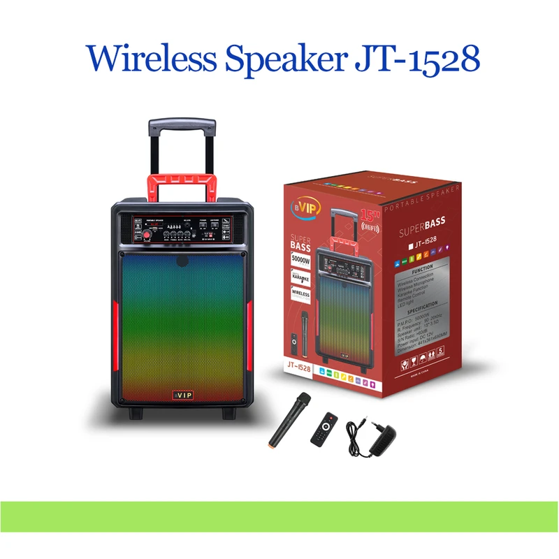 اسپیکر بلوتوثی قابل حمل مدل JT-1528, دارای باتری داخلی میباشد و می توان آن را شارژ کرد و به مکان دلخواه خود ببریم، به همین دلیل هم بسیار پرطرفدار هستند. کمپانی های معتبر زیادی در تولید اسپیکر های قابل حمل در رقابت هستند. اسپیکر بلوتوثی مدل «JT-1528» یک اسپیکر 15 اینچی می باشد و دارای نورپردازی بسیار جذابی است. شما می توانید با اتصال میکروفون وایرلسی که به همراه این محصول می باشد صدای خود را از اسپیکر بشنوید. همچنین می توانید یک موزیک بی کلام پخش کنید و خودتان به عنوان یک خواننده شعر مورد علاقه خود را بخوانید. مدت زمان مورد نیاز برای شارژ کامل این محصول 10 تا 12 است و پس از آن قادر است به مدت 4 تا 5 ساعت موسیقی پخش کند. در قسمت جلوی این اسپیکر، کلید های مدیریت صدا، کلید «on/off»، و ورودی های کارت حافظه، فلش و «AUX» قرار دارند. همچنین این محصول دارای قابلیت TWS (دو دستگاه که امکان اتصال به بلوتوث داردند، با یکدیگر جفت شوند.) دارد. قابلیت TWS در اسپیکر این امکان را فراهم میسازد تا امکان شنیدن موسیقی به صورت استریو را بتوان تجربه کرد به نحوی که کانالهای صوتی چپ و راست به طور کامل از یکدیگر مجزا باشند.